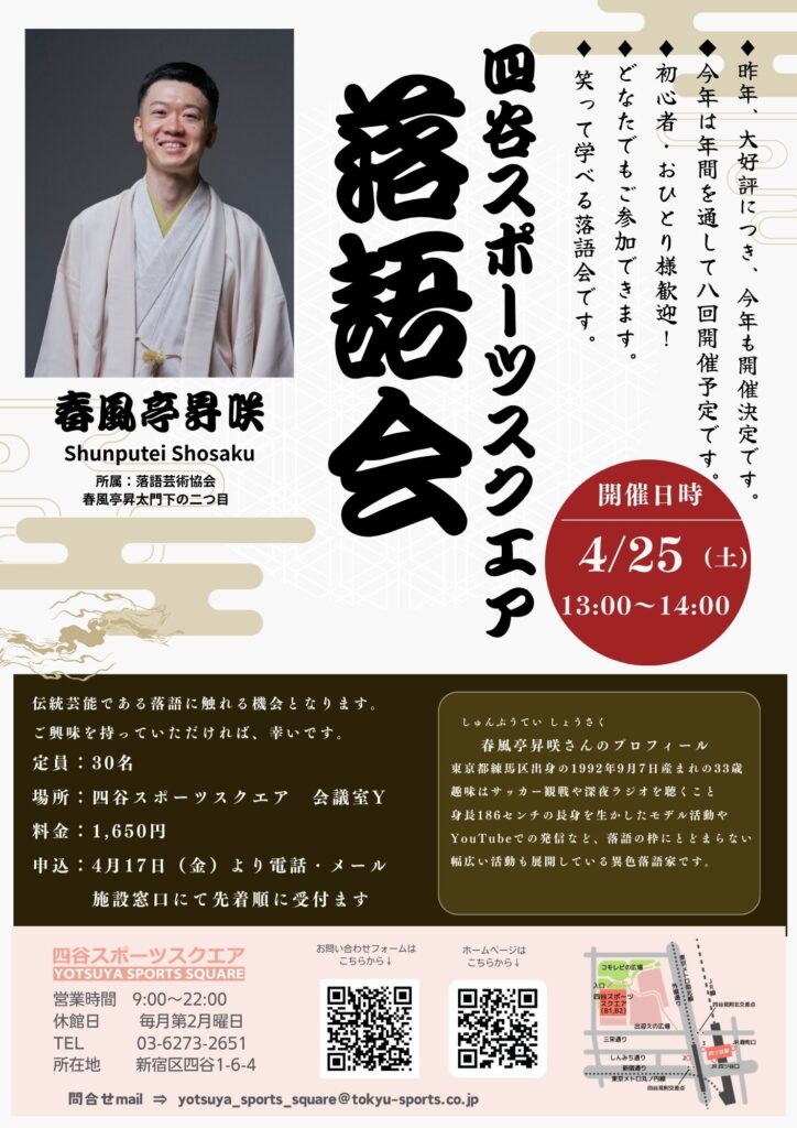 4月25日(土)に、昨年も開催し、大好評だった「四谷スポーツスクエア 落語会」を開催いたします!