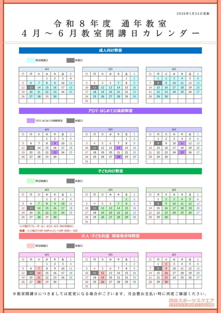 【通年教室】令和8年度4月~6月 開講日のご案内